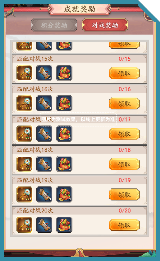 对局奖励:每次对战结束根据胜负获得积分,积分用于领取成就奖励。