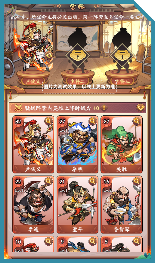 战斗中,上阵的主将必定出场,同一阵营至多任命一名主将。