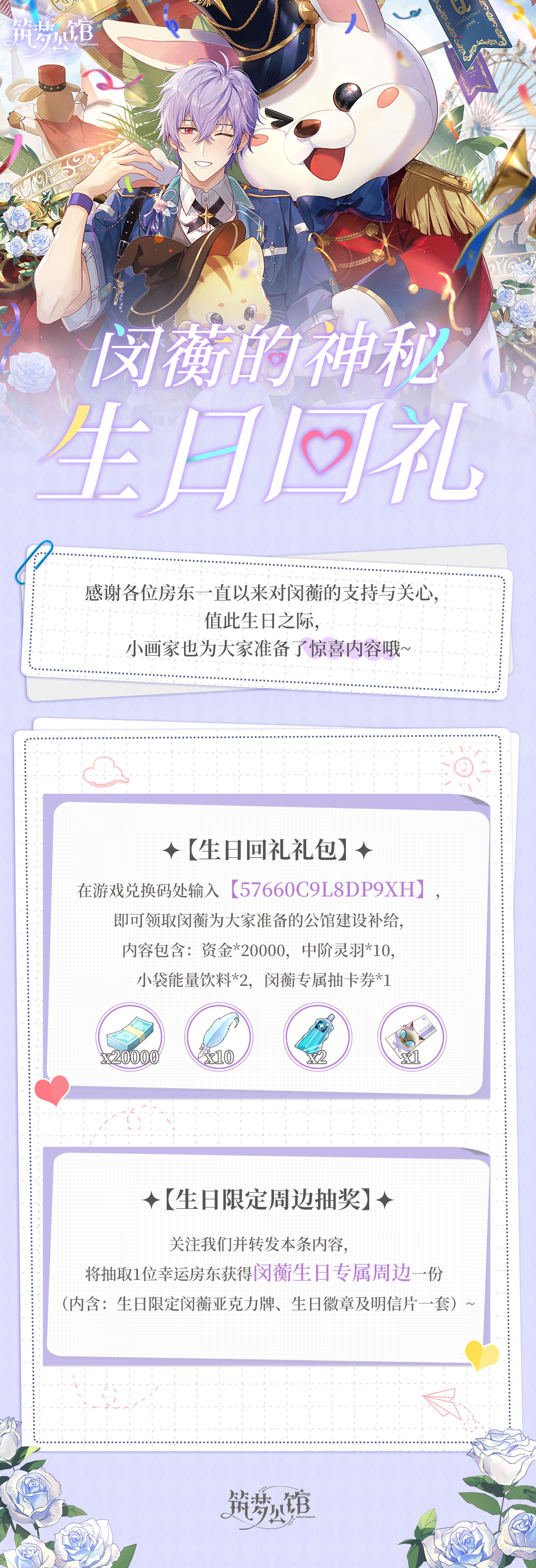 关注我们并在帖子下方回复本条内容的转载截图,我们将抽取1位幸运房东获得闵蘅生日专属周边一份哦~