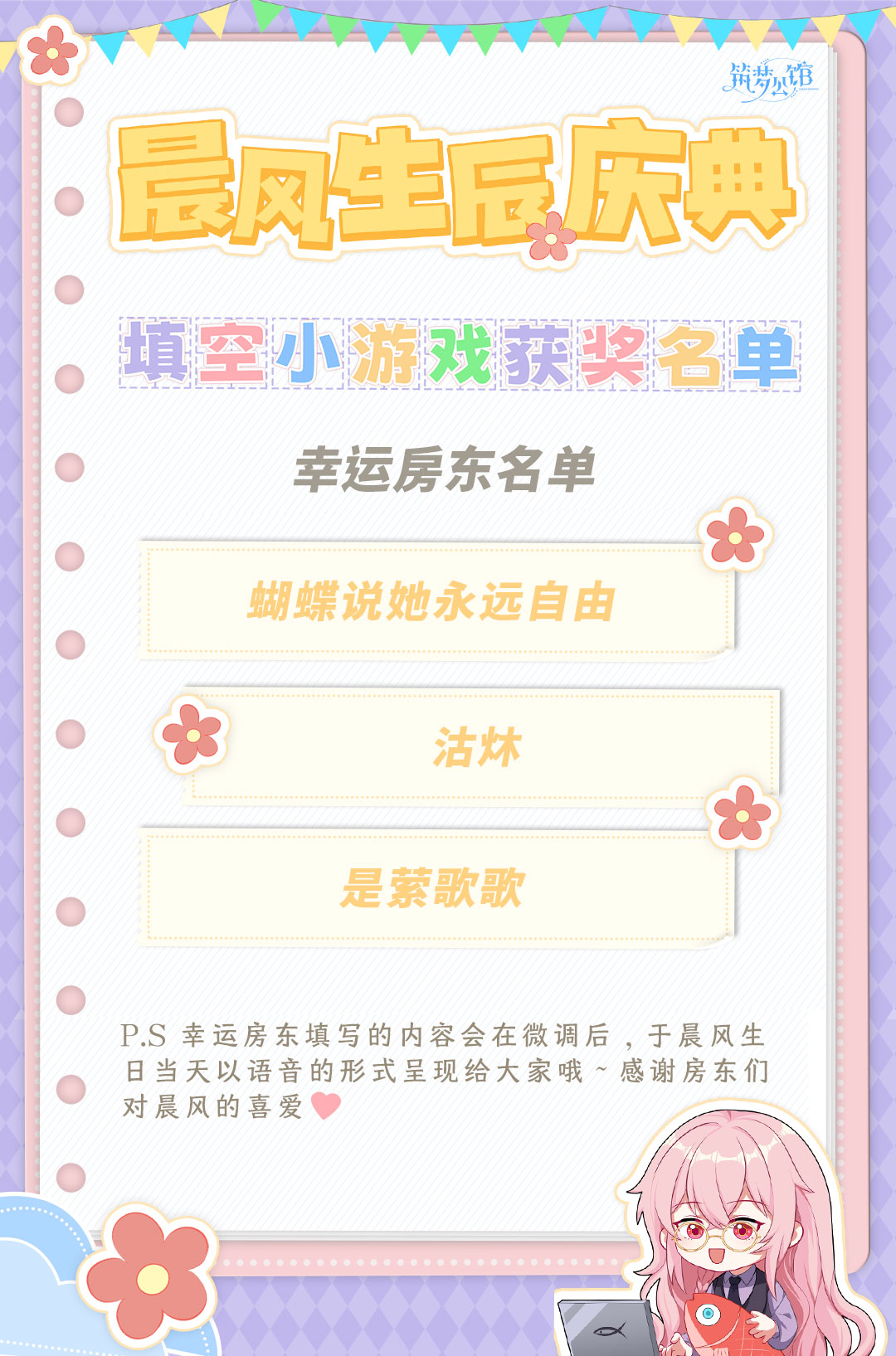 晨风生日语音定制征集活动已顺利落下帷幕,感谢一直以来房东们对晨风的喜爱与支持~本次征集到的故事内容将在微调延展后,由晨风在生日当天亲口讲述给大家听!故事发布方式还请关注我们后续的推送内容