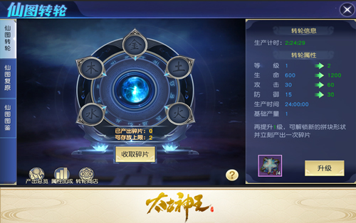 仙图是玩家等级达到超凡150级后解锁的新系统,系统开启后玩家会获得一个仙图转轮,转轮不但会定期产出仙图碎片,自身还可以不断成长解锁更多能力。除了直接生产碎片外,通过神域运宝、五行灵珠获得的转轮精华在仙图商店也可以兑换需要的碎片。