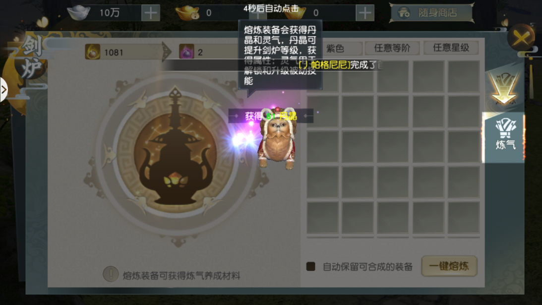 48级开启剑炉系统玩法,指引选择紫色以下装备进行熔炼,熔炼的材料壳练气,这个是之后背包不足,把不需要的低级装备丢弃的会常用到的其中一个玩法哟~