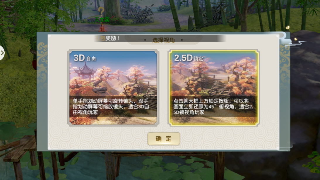 剧情到轻功后有选择视角,一个是3D自由视角,还有一个是锁定视角。
