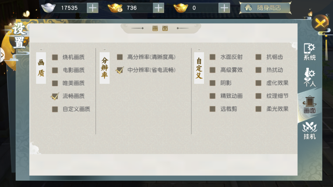 然后会让选择画质,当然流畅最好,如果你的设备是very well的话,可以选择其他,感受不同程度的视觉享受。前面的选太快忘记截图了,后续想改变画质可以选择左下角然后设置-画面里面选择喜欢的画面展示。