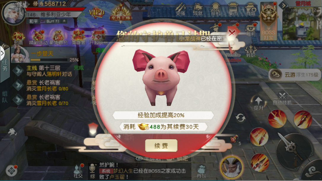 完成第一个章节会送一只小猪“小曼”,是有体验期限的,体验期限一到就需要去商城用绑金购买,好的!!!本来截好图了放了文档,随手保存的时候。。。。。。呵呵,呵呵呵,文档自动退出了,小编开始崩溃了,只剩下一个跟随脚边的截图了。。。。。。小编开始自闭中。。。。。。
