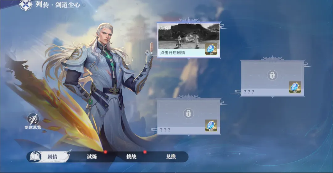 【列传·剑道尘心】分为剑道尘心·剧情、尘心·试炼和剑道尘心·挑战两个部分