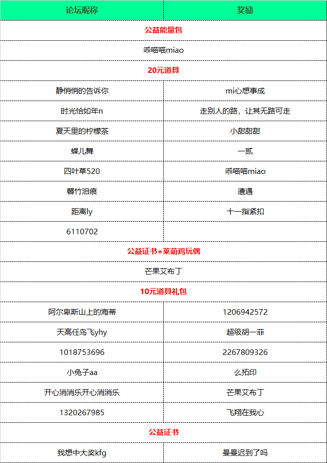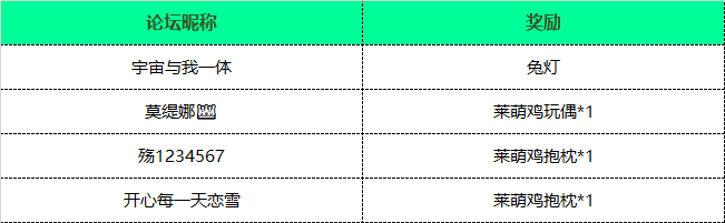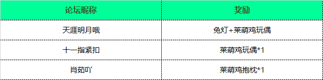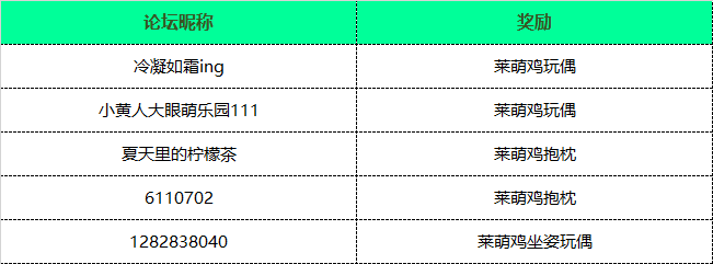 由于仓库现在没有莱萌鸡坐姿玩偶和囤囤背包了,现在奖励修改为任意1个坐姿玩偶和栗雄背包,请大家在填写奖励的时候注意哦~