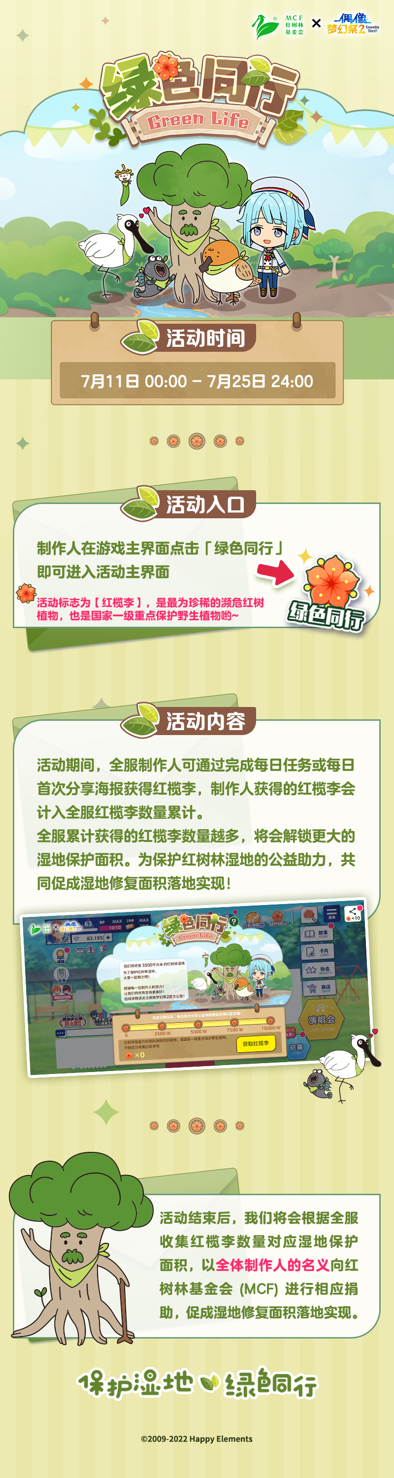 活动期间,全服制作人通过参加游戏内「绿色同行」活动,完成每日任务或每日首次分享海报获得红榄李,制作人获得的红榄李会计入全服红榄李数量累计。全服累计获得的红榄李数量越多,将会解锁更大的湿地保护面积。活动结束后,我们将会根据全服收集红榄李数量对应湿地保护面积,以全体制作人的名义向红树林基金会(MCF)进行相应捐助,促成湿地修复面积落地实现。