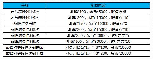 活动期间内,完成指定巅峰对决任务,可获得额外斗魂和刀灵召唤石,斗魂可在斗魂商店中进行道具兑换。