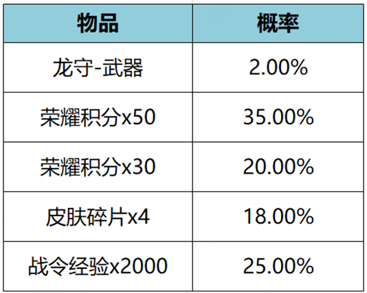 购买礼包必得酷炫机甲(1日),可额外随机获得以下之一:荣耀积分x50、荣耀积分x30、皮肤碎片x4、战令经验x2000、龙守-武器。累计50次必得龙守-武器。