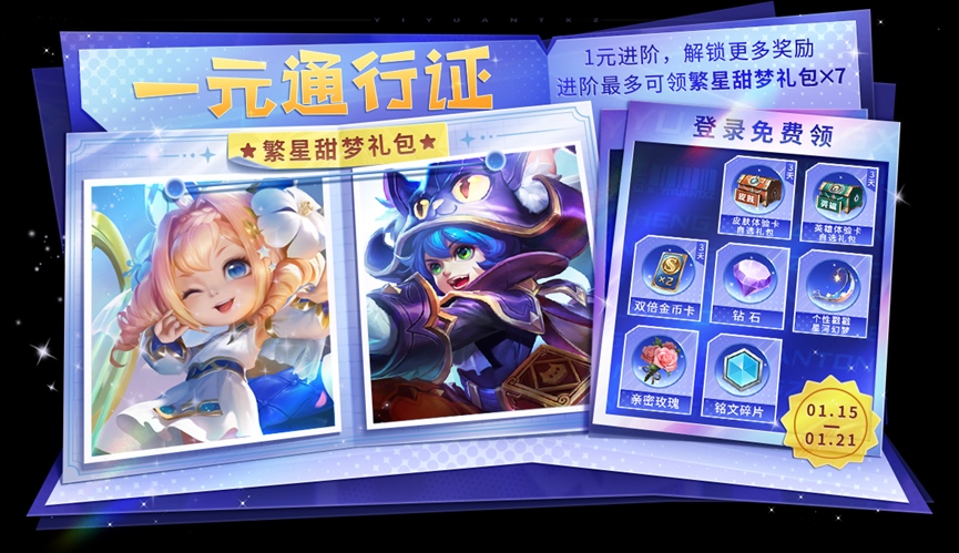 一元通行证活动即将开启,活动期间,召唤师每日登录即可领取奖励;且召唤师可在活动界面1元解锁进阶奖励,领取繁星甜梦礼包(开启礼包有机会得繁星吟游、黑猫爱糖果)、荣耀积分、个性戳戳、皮肤碎片等更多好礼,请大家记得来参与领取奖励哟~
