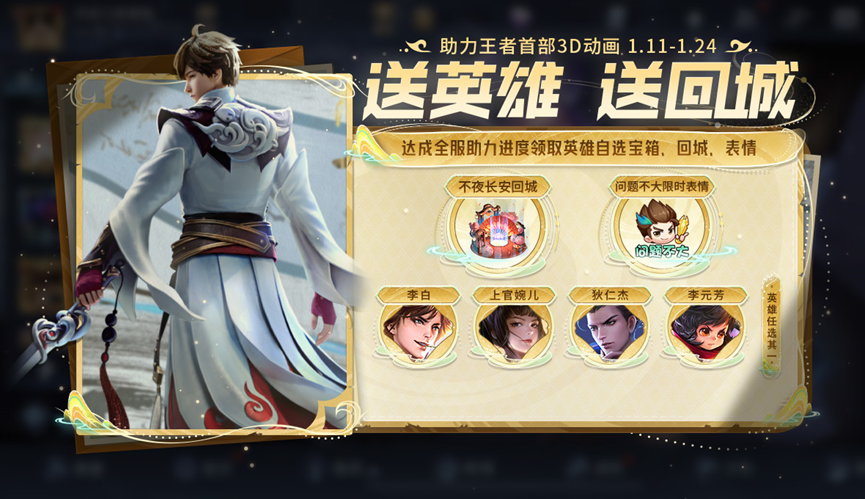 内容一:全服助力!送免费英雄回城活动入口:活动中心-荣耀之章-全服助力