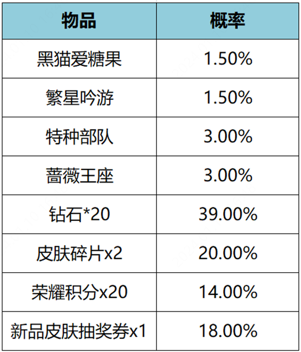 购买礼包必得红蓝对决(1日),可额外随机获得以下之一:繁星吟游、黑猫爱糖果、蔷薇王座、特种部队、皮肤碎片*2、荣耀积分*20、新品皮肤抽奖券*1、钻石*20。累计100次必得繁星吟游和黑猫爱糖果。