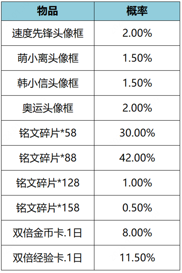 头像框礼包上架打开后可随机获得以下奖励之一:速度先锋头像框、萌小离头像框、韩小信、奥运头像框、双倍金币卡:1日、双倍经验卡:1日、铭文碎片x158/128/88/58。