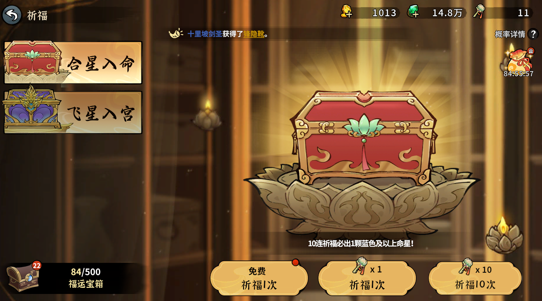 2.合星入命祈福保底规则:仅限十连祈福时,如果前面9次祈福都未命中蓝色或蓝色以上品质物品时,则在第10次祈福命中蓝色物品概率为100%。