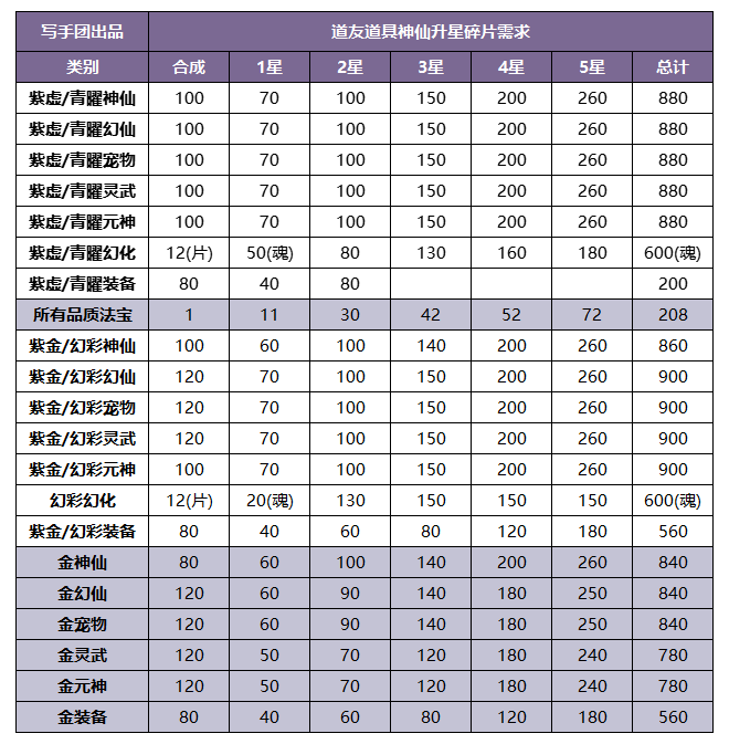 活动即将来临,小狐狸赶紧拿出珍藏的『神仙&道具升星碎片需求表』,希望对大家有所帮助呀▼▼