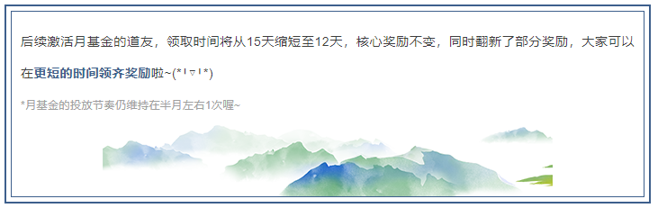 ◆活动内容:活动期间,双月卡用户单笔充值指定额度即可激活超值基金!激活时间结束后开始领取,连续12天每天都能领取丰厚奖励!