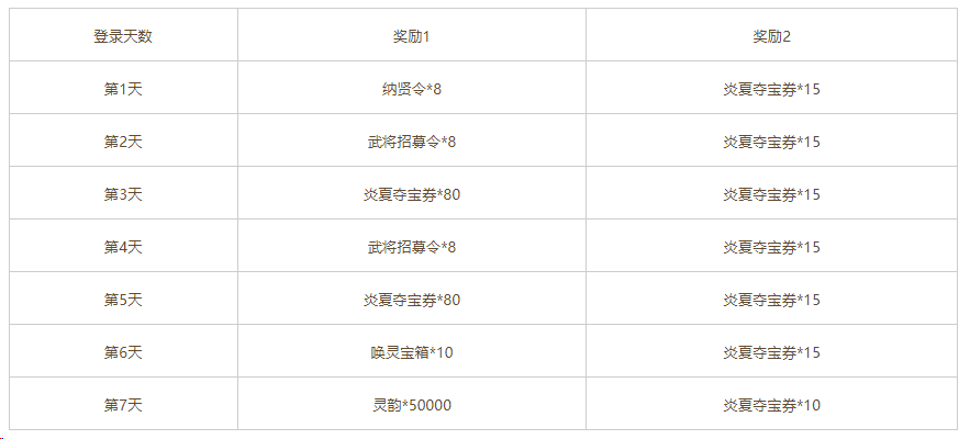 单笔充值12800元宝,可领取奖励:纳贤令*10、炎夏夺宝券*100、夺宝券*100,3选1,每日限完成1次。