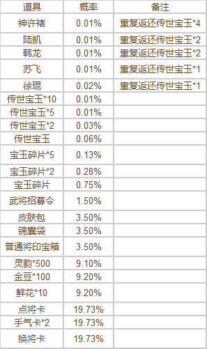 每开启一次神许褚礼盒必定获得灵韵*250,并随机获得以下道具。