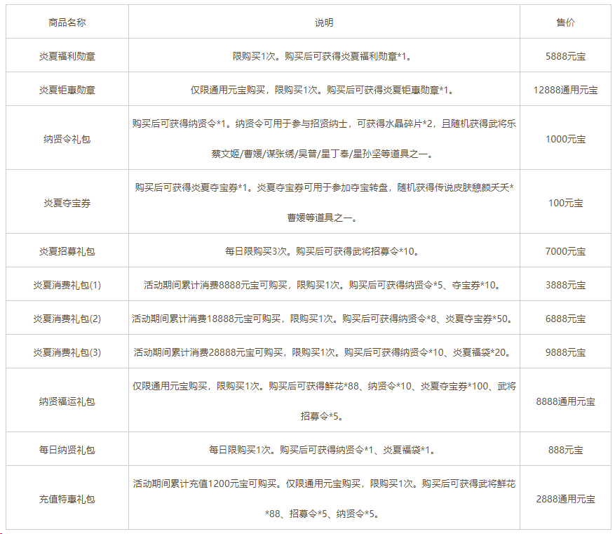 累计消费3888元宝,可领取奖励:纳贤令*1、炎夏福袋*1,限完成10次。