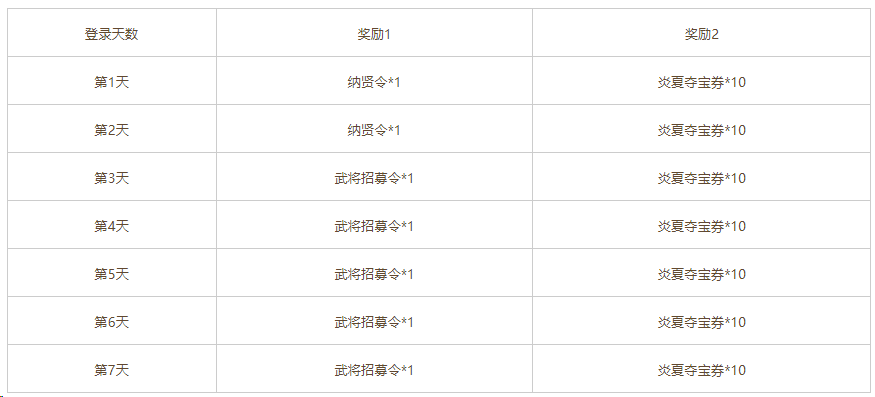 6/23~6/28,单笔充值1200元宝,可领取奖励:武将招募令*3,夺宝券*10,限完成1次。