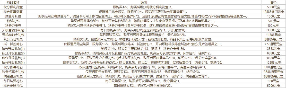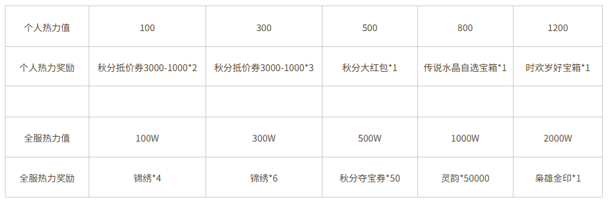 单笔充值32800元宝,可领取奖励:秋分大红包*1,秋分抵价券2000-1888*3,限完成1次。秋分限定额外加赠。