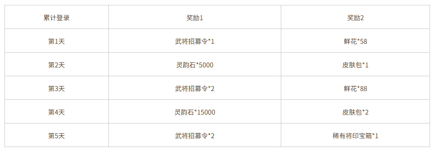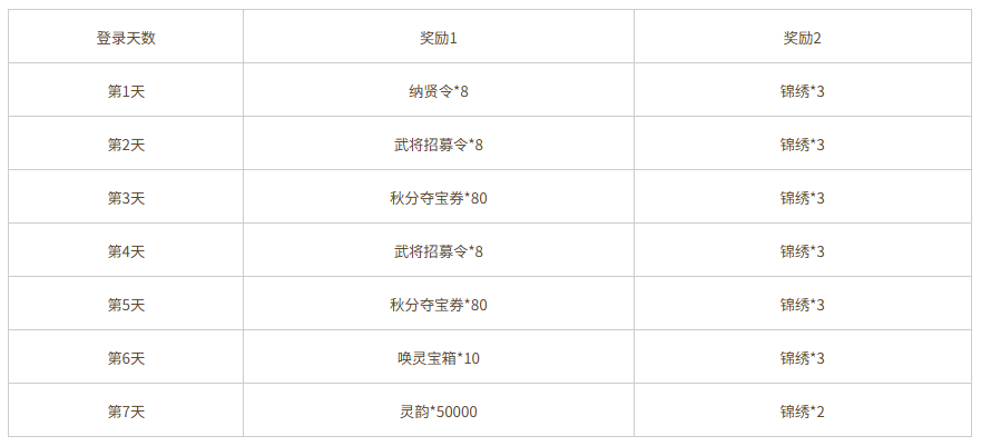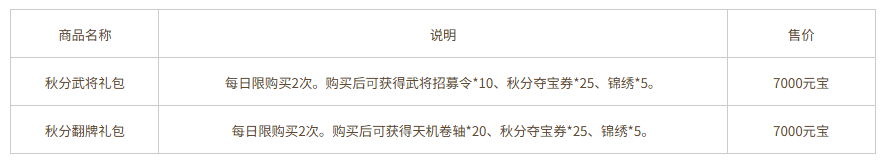 每日充值达到3000元宝,可领取奖励:武将招募令*2、锦绣*4、秋分夺宝券*20,3选1,每日限完成1次。