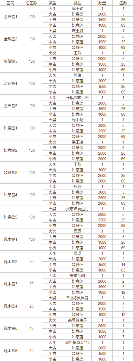 2、每种签筒中拥有1支大奖签与若干支普通签,抽到大奖签必定获得对应签筒内大奖道具,抽到普通签根据签的大吉、中吉、小吉获得对应数量如意莲。