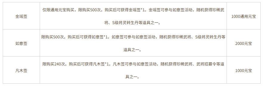1、玩家可使用金瑶签、如意签、凡木签分别在对应签筒中进行抽签,每种签筒所消耗签种与数量各有不同,玩家可选择自己心仪大奖的签筒进行抽签。