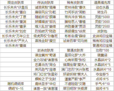 秋日传说自选宝箱:开启后可在以下道具中自选其一获得——五经弼国*程秉、斩波遏浪*谋王凌、慕羽成城*孙狼、文涛阅澜*孙瑜、拔剑而起*星袁绍、巾帼倩影*星孙尚香、邀月论道*王烈、春风不竞*袁谭袁尚袁熙、千山璨月*芮姬、云上拾逸*周不疑、凌风肃雪*庞会、玉芮花意*芮姬、莲心姝影*滕公主、日暮晚风*乐蔡文姬、夜阑扰梦*丁尚涴、菏沐清波*曹宪、锦书释卷*曹宪、所欲无度*张曼成、清雅趣逗*清河公主、众乐和鸣*乐蔡文姬、皮肤包*5