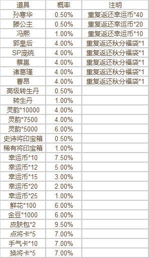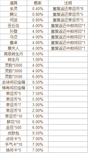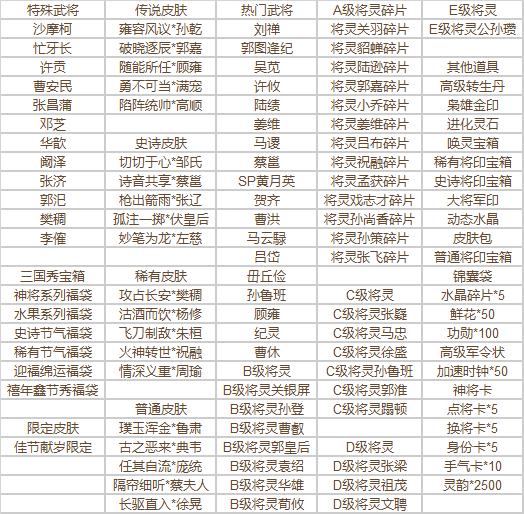 5.本期连连看活动,每次必定掉落高价值道具之一,包括特殊武将、特殊节日皮肤、完整C级将灵、B级将灵、高级转生丹、枭雄金印道具之一。