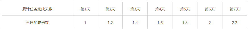 3、连续完成天数越多,额外加成越高,如玩家某一日未完成某项专属任务,则该项任务的加成倍数重置为1倍。
