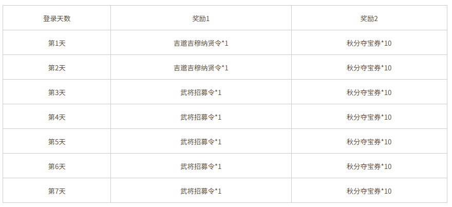 单笔充值3000元宝,可领取奖励:武将招募令*3、秋分夺宝券*30、夺宝券*30,3选1,每日限完成1次。