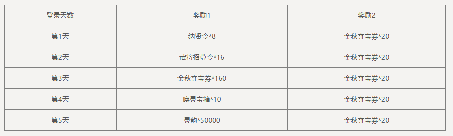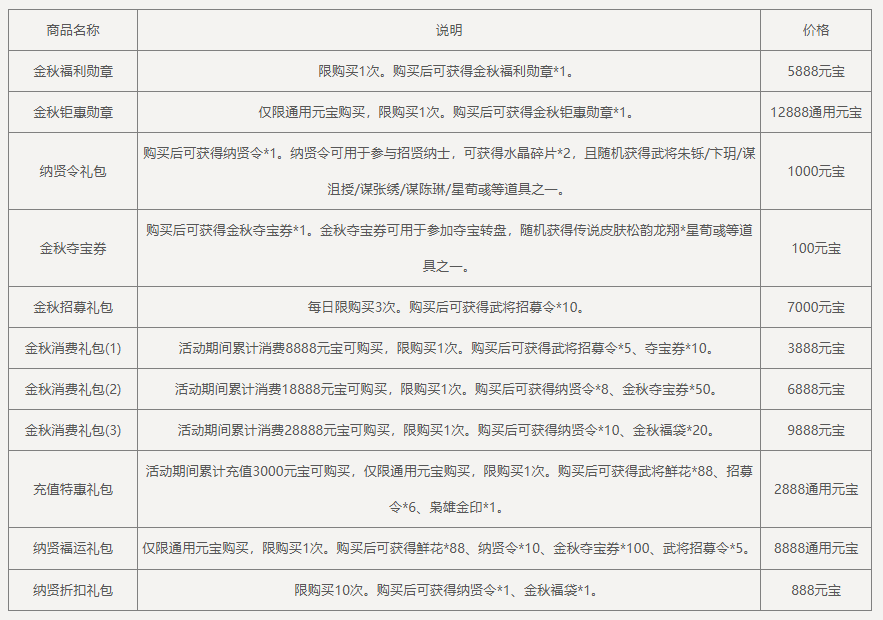 累计消费28888元宝,可领取奖励:纳贤令*3,金秋夺宝券*30,限完成1次。