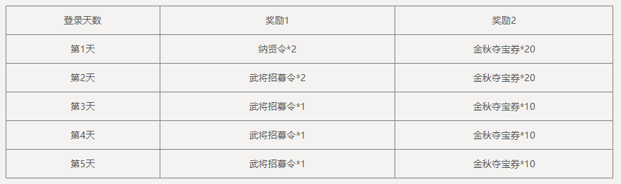 单笔充值6000元宝,可领取奖励:纳贤令*6、武将招募令*6、金秋夺宝券*60,3选1,每日限完成1次。