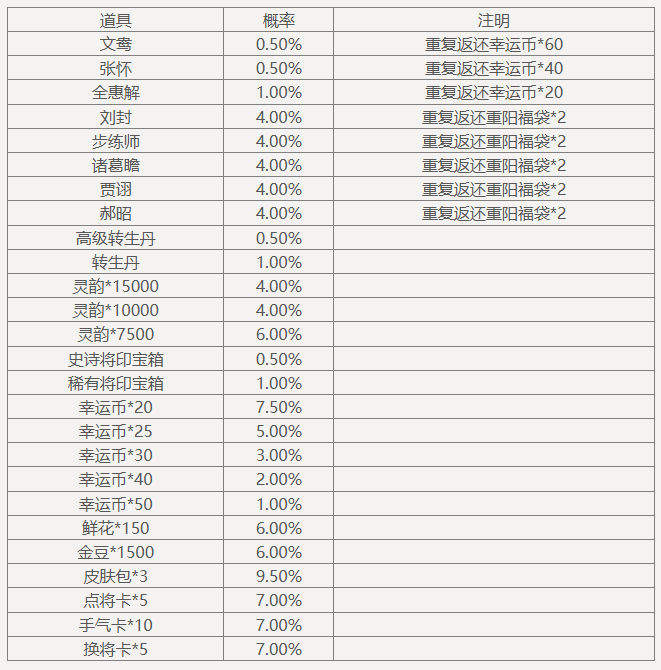 每进行一次重阳夺宝获得1点吉运,吉运达到100点后的下一次抽取,必然获得吉运道具之一。活动期间,玩家每日前两次十连夺宝转盘享有特惠折扣 ! 仅消耗3888元宝。