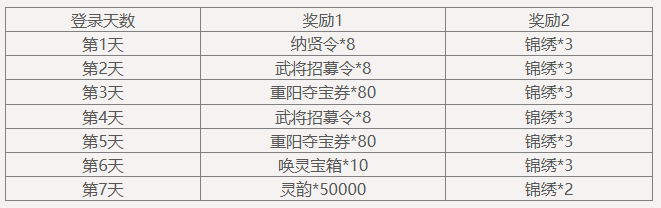 每日充值达到3000元宝,可领取奖励:武将招募令*2、锦绣*4、重阳夺宝券*20,2选1,每日限完成1次。