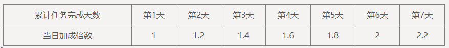 3、连续完成天数越多,额外加成越高,如玩家某一日未完成某项专属任务,则该项任务的加成倍数重置为1倍。