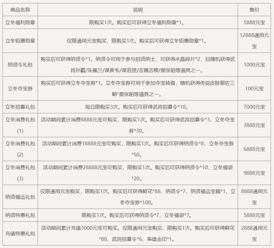 累计充值12888元宝,可领取奖励:立冬红包*1,武将招募令*3,限完成1次。
