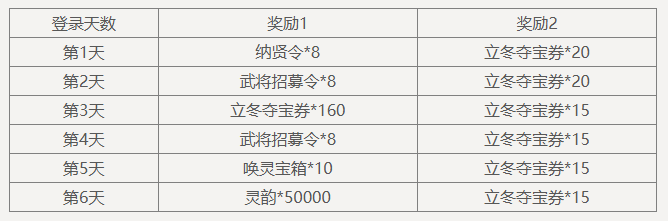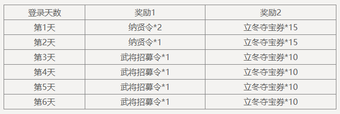 立冬限定福利,单笔充值6000元宝,每日可领取奖励:纳贤令*2。