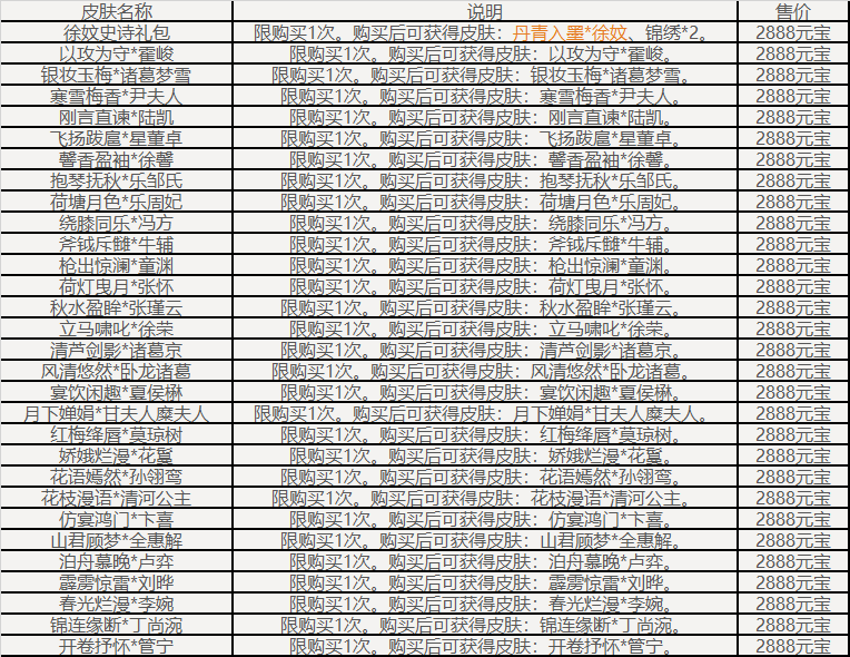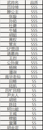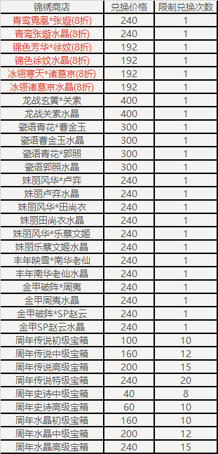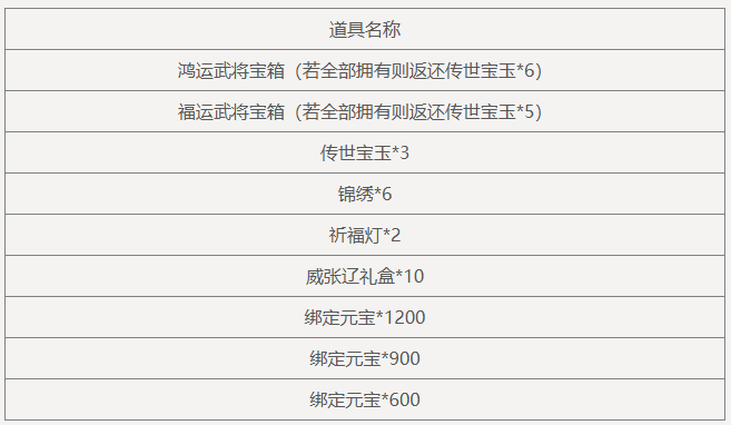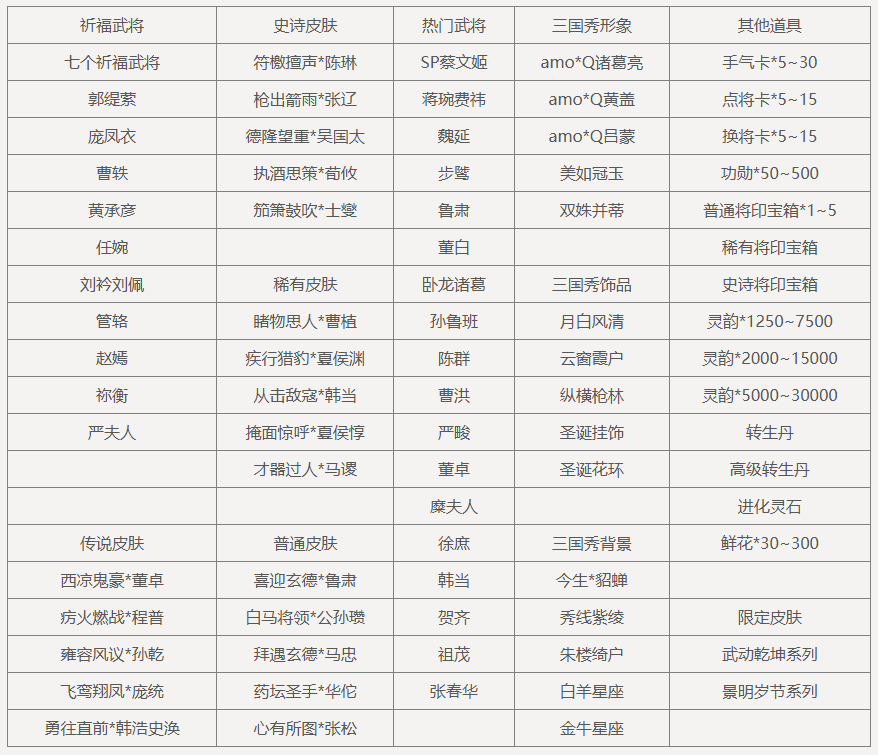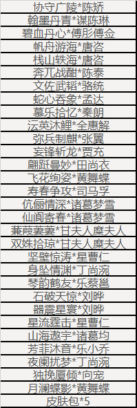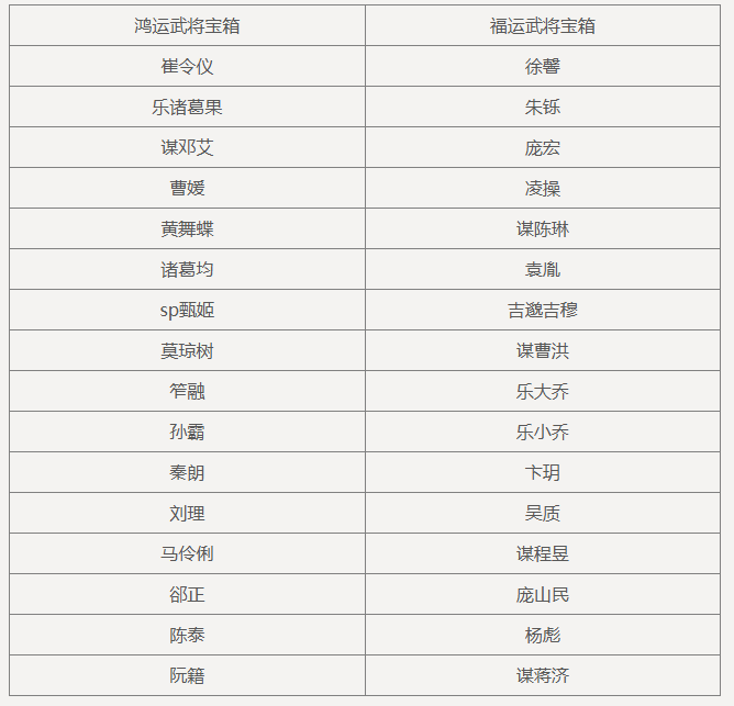 祥云武将宝箱(随机获得未拥有的以下武将之一,如全部拥有则返还传世宝玉*2):崔令仪、乐诸葛果、谋司马师、曹媛、SP甄姬、郤正、王濬、马伶俐、刘理、笮融、庞宏、马铁、凌烈、SP祝融、袁胤、徐馨、谢灵毓、霍峻、凌操、卞玥