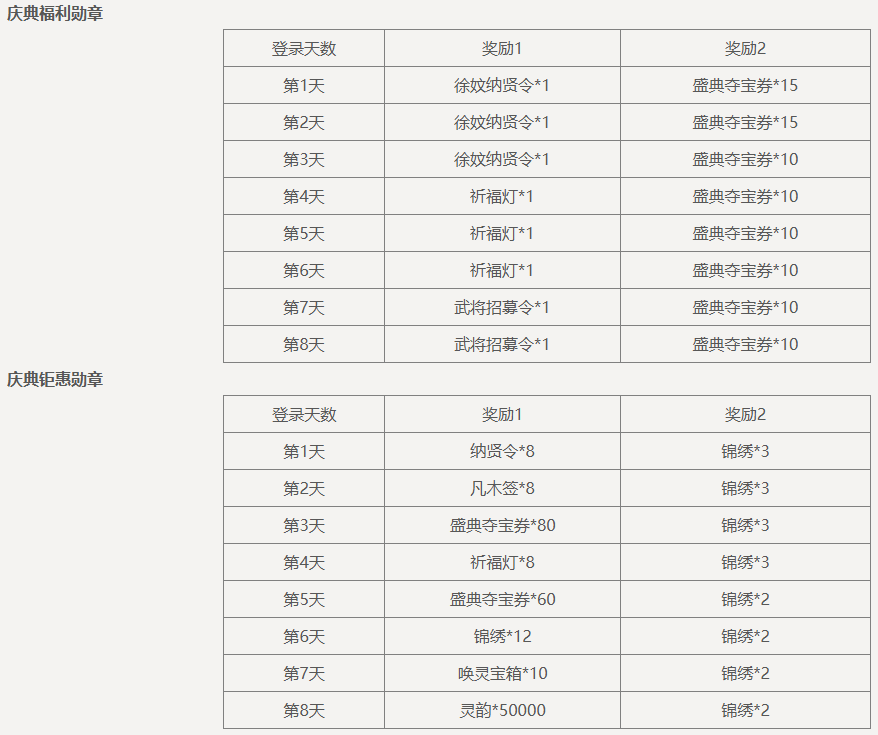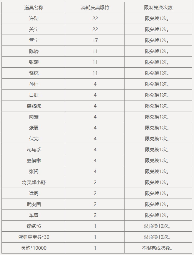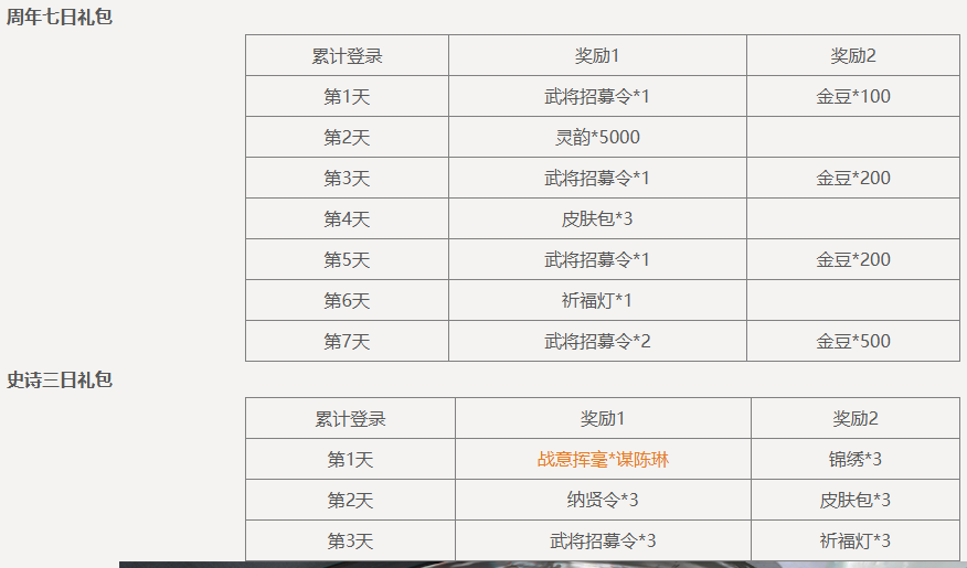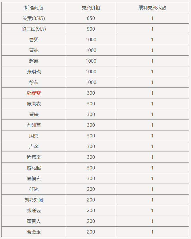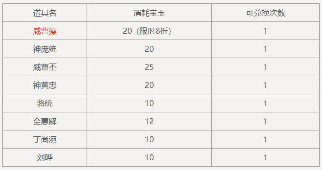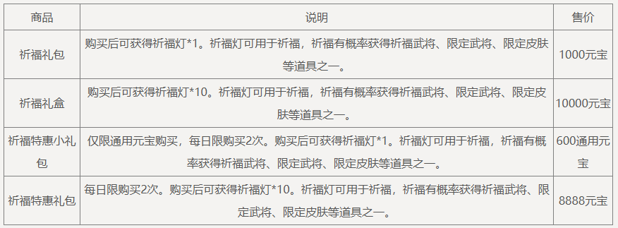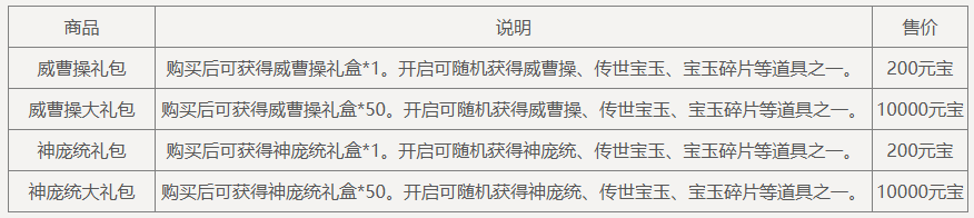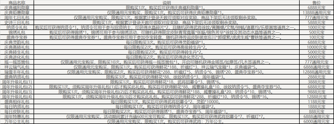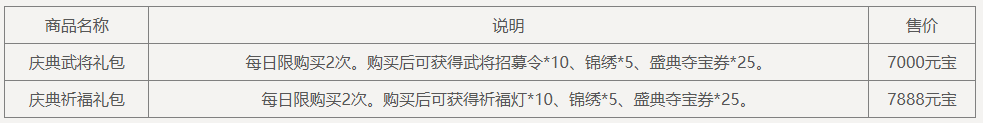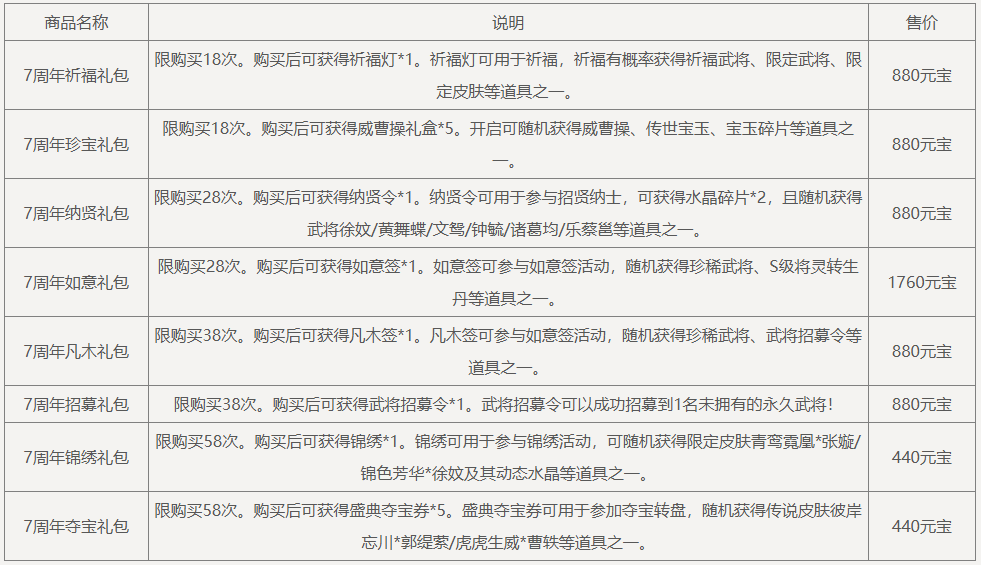 盛典抵价券(1588-1000):在商城购买商品祈福礼包、威曹操礼包、神庞统礼包、纳贤令礼包、锦绣礼包、盛典夺宝券、礼包名含“7周年”前缀的特惠礼包、招募令礼包等原价商品时超过1588元宝,可抵消1000元宝的价格(12月6日后可使用)。
