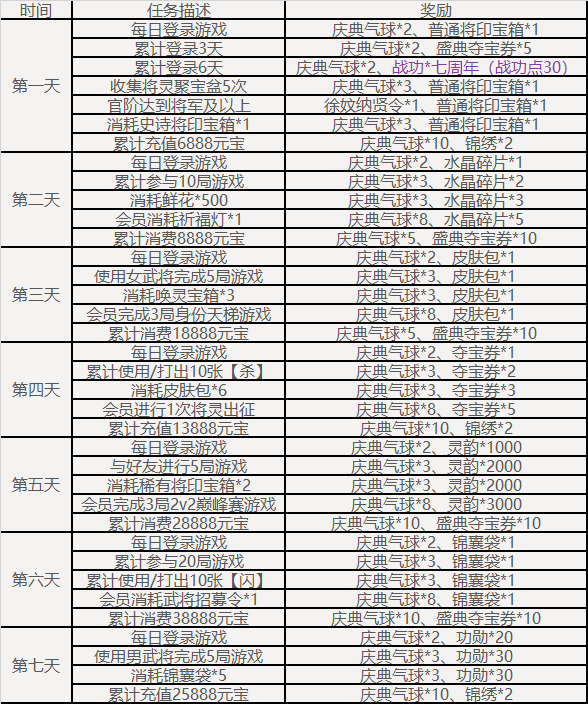 完成2v2排位赛10局,可领取:庆典祥云*5,7周年宝箱*3,限完成1次。