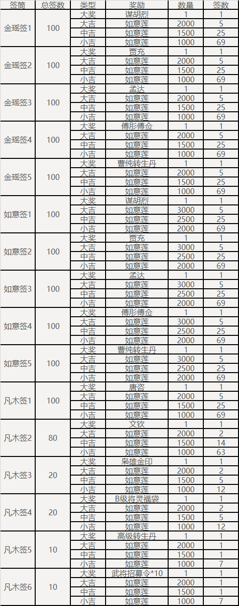 每种签筒中拥有1支大奖签与若干支普通签,抽到大奖签必定获得对应签筒内大奖道具,抽到普通签根据签的大吉、中吉、小吉获得对应数量如意莲。