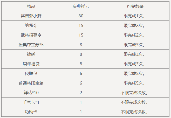 消耗庆典祥云前往兑换商店兑换将灵郭小野、纳贤令、皮肤包等丰富奖励!