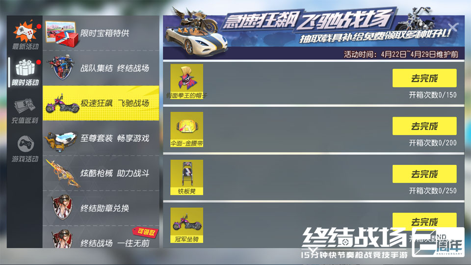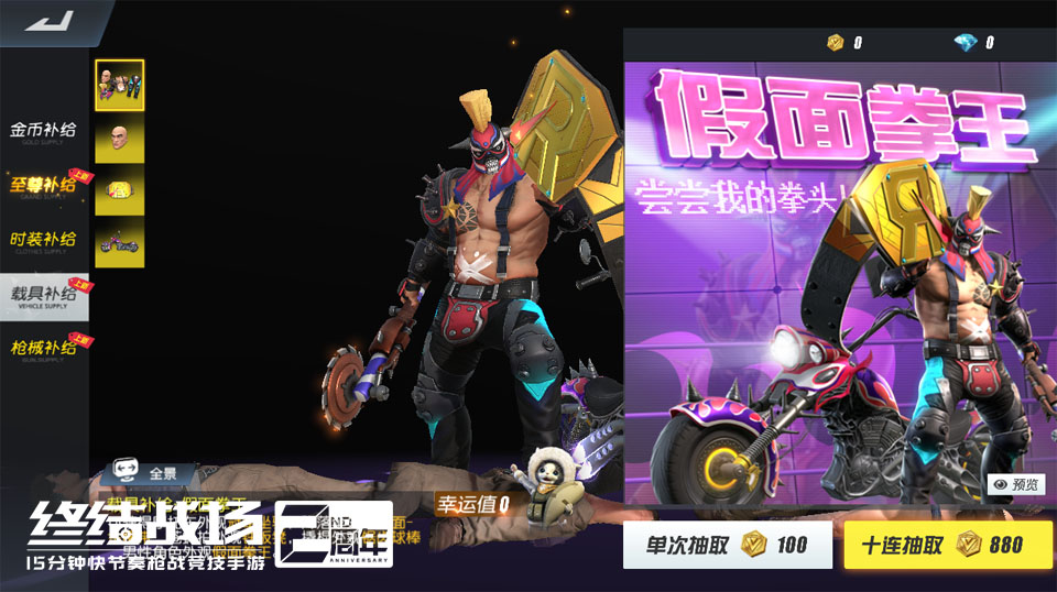 本周更新后,“假面拳王”的现身让所有战士都有机会体验变身大力士、拿下金腰带的快乐。玩家只要抽取载具补给,就有几率获得降落伞外观伞面“金腰带”、男性套装“假面拳王”、撬棍外观“锯齿球棒”、苍蝇拍外观“铁板凳”、摩托车外观“冠军坐骑”等精品道具,做最酷大赢家。