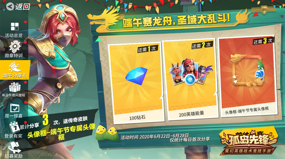 临近端午佳节,《孤岛先锋》也为玩家准备了专属的惊喜福利。在6月22日-6月28日期间,玩家只需分享游戏向好友发出集结令,即可获得对应奖励,根据累计的分享次数可以获得钻石、英雄能量以及端午节专属头像框!