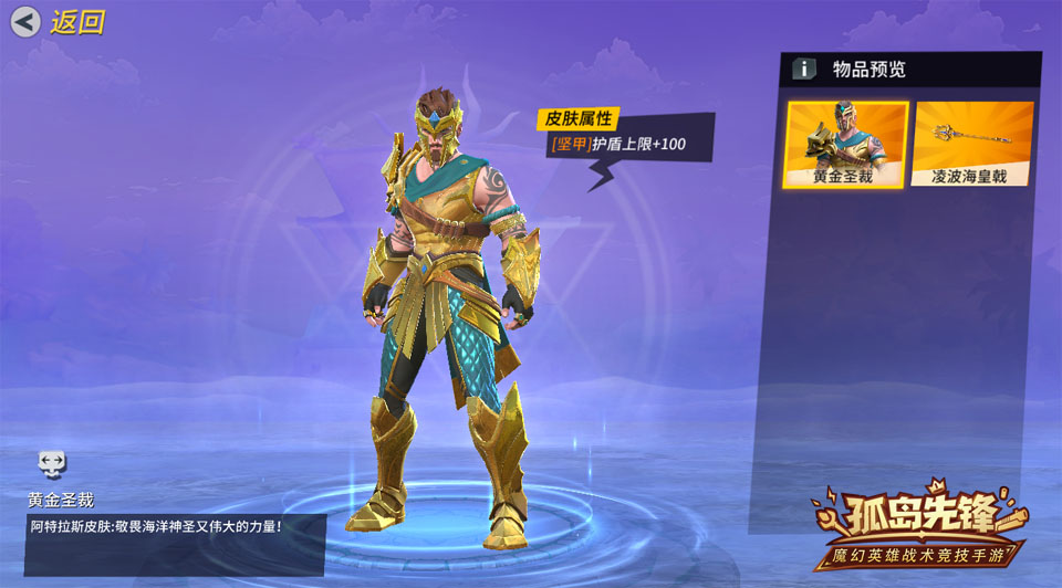 开启“黄金圣裁捆绑包”后,玩家可以直接获得精品时装“黄金圣裁”以及武器皮肤“凌波海皇戟”。