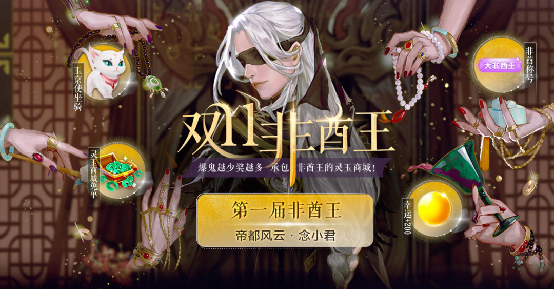 双十一当天抽取全服唯一非酋王!获得灵玉商城免单、9999元宝、脱非入欧金色称号、沧海谣时装、海中君坐骑等15项特殊福利!