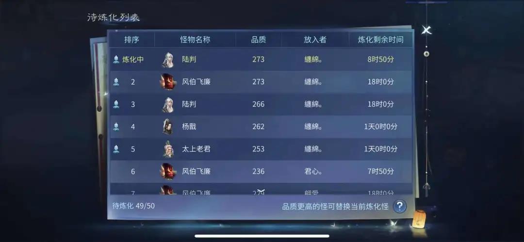 雀神门的小伙伴炼妖等级基本都保持在5-6级,每周的缚妖索全部全部拉满,除了列表塞满,大家的妖兽也都像缠绵。一样,有几个库存……